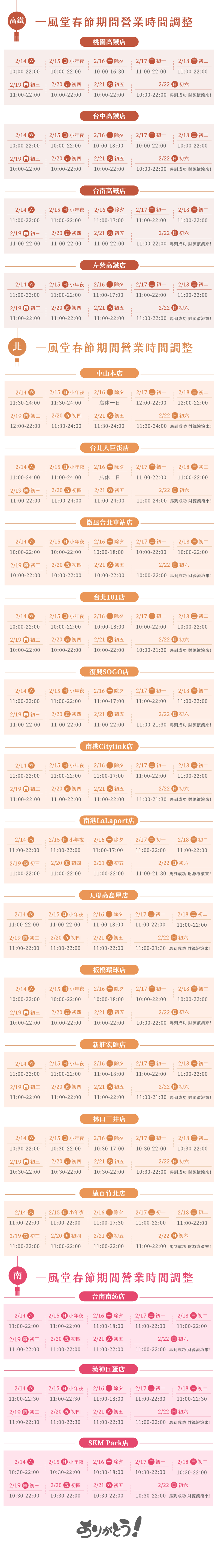 2026年農曆期間‧一風堂全台店鋪營業時間一覽表